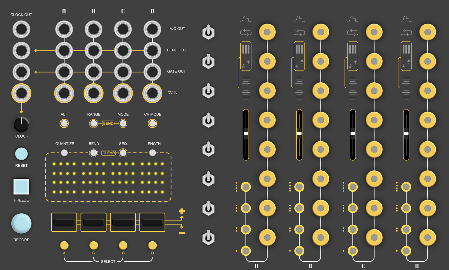To record the movements of the Benders into a channels sequence, enable RECORD and start bending. The sequencer will record the raw CV values of the bender into the sequence, giving you the option to apply Pitch Bend or Ratchet effects after the fact, should you wish too.